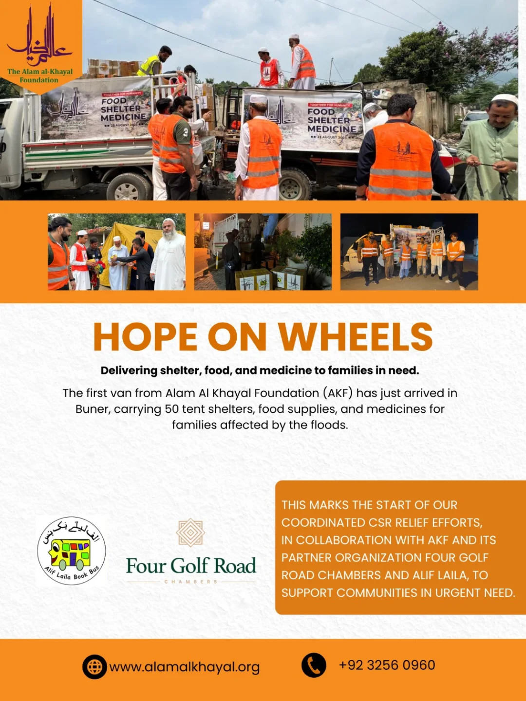 The first van from Alam Al Khayal Foundation (AKF) has just arrived in Buner, carrying 50 tent shelters, food supplies, and medicines for families affected by the floods.